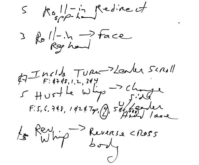 Intermediate Notation: Similarly, intermediate Hustle Notation consolidated the movements into smaller groupings ("chunks") and is able to use arrows to express different ending positions.